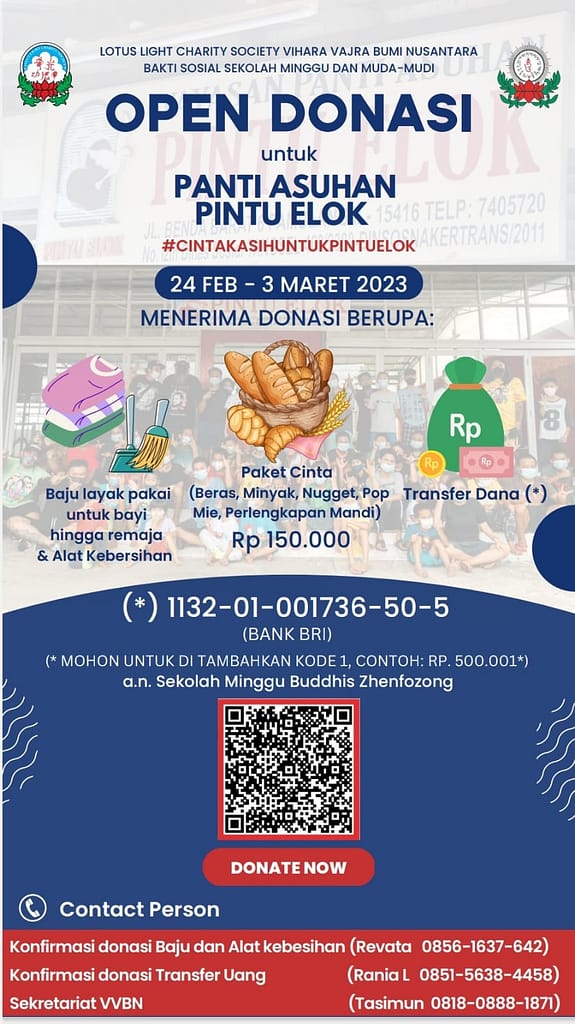 Dana paket dapat ditransfer ke BRI 113201001736505 an. Sekolah Minggu Buddha Zhenfozong.