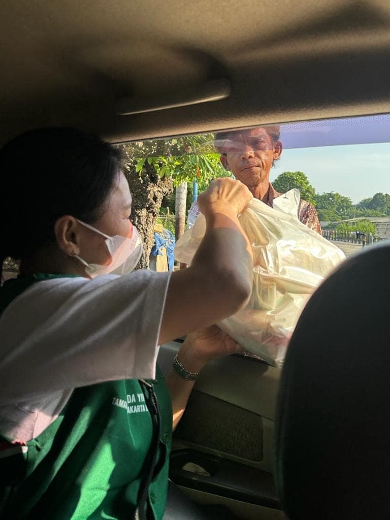 Kegiatan pembagian paket sembako dilakukan dengan berkendara mobil.