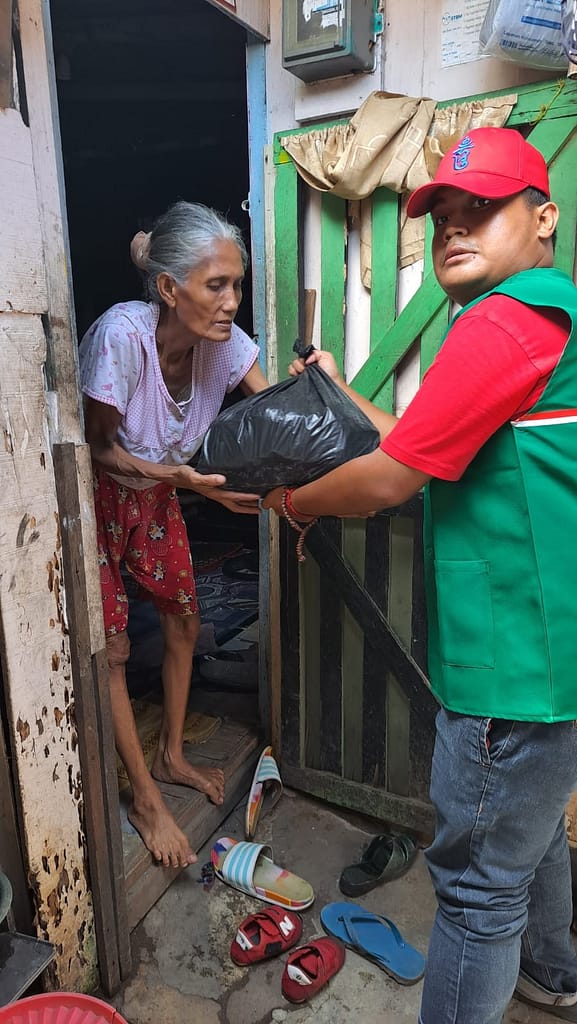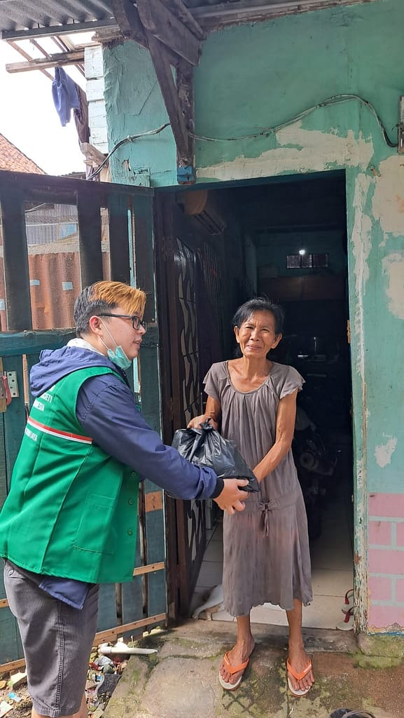 Ketika jam menunjukkan pukul 10 pagi, acara pembagian sembako pun dimulai. Para warga sekitar dan dari wilayah sekitarnya yang membutuhkan, antusias dan terharu menyambut para relawan yang membawa paket sembako tersebut.