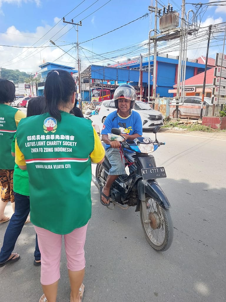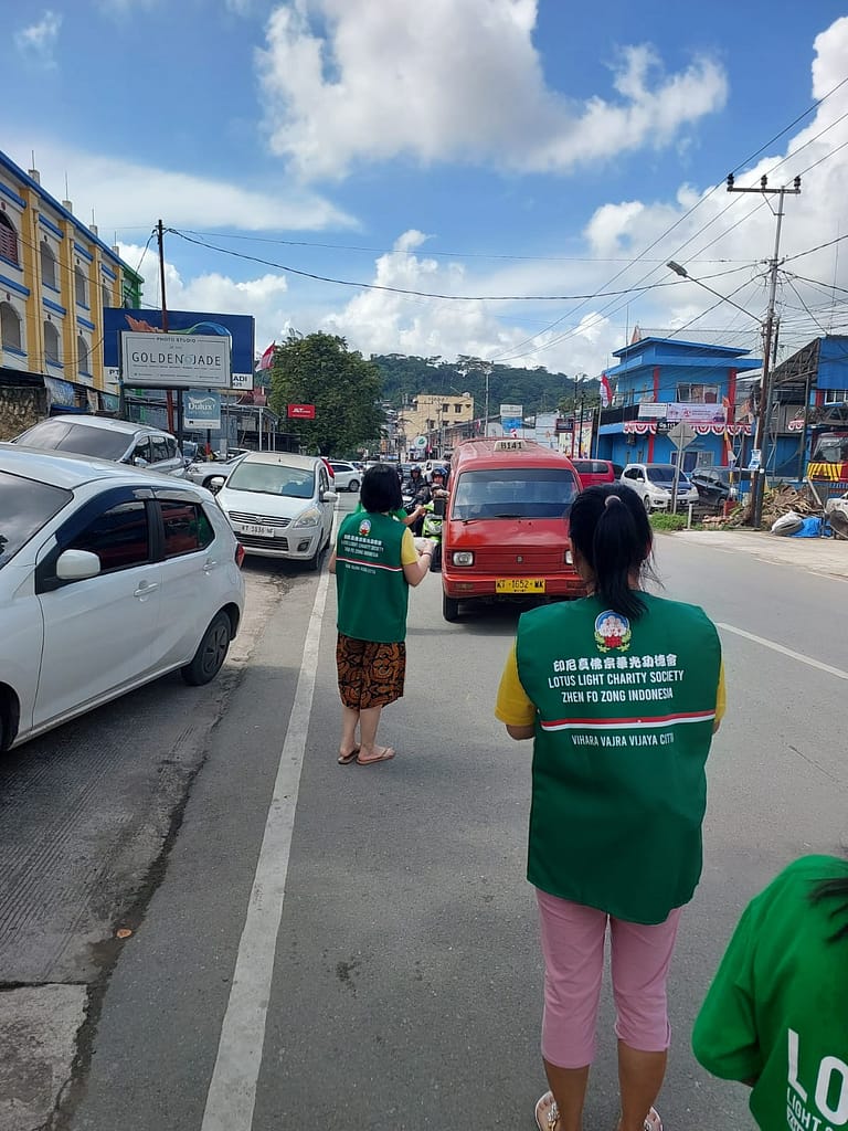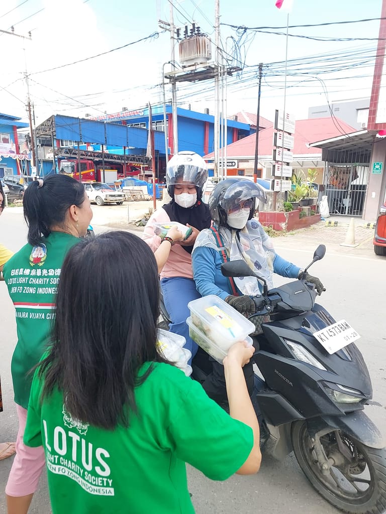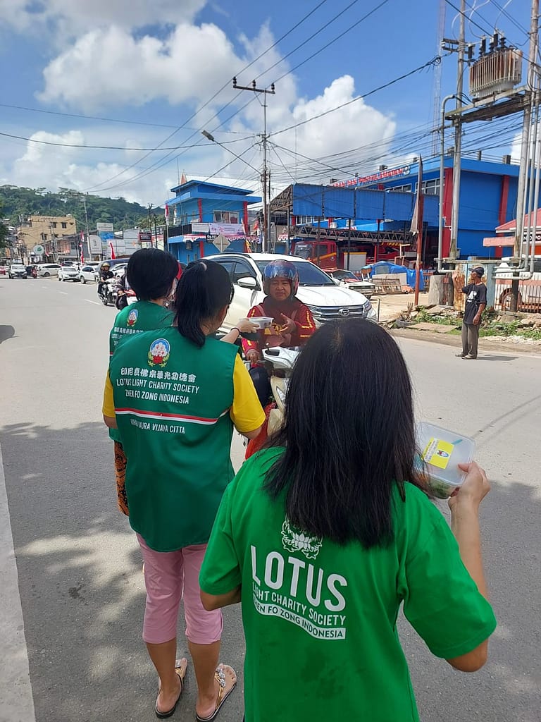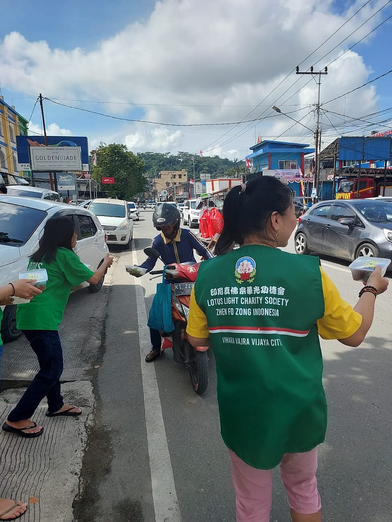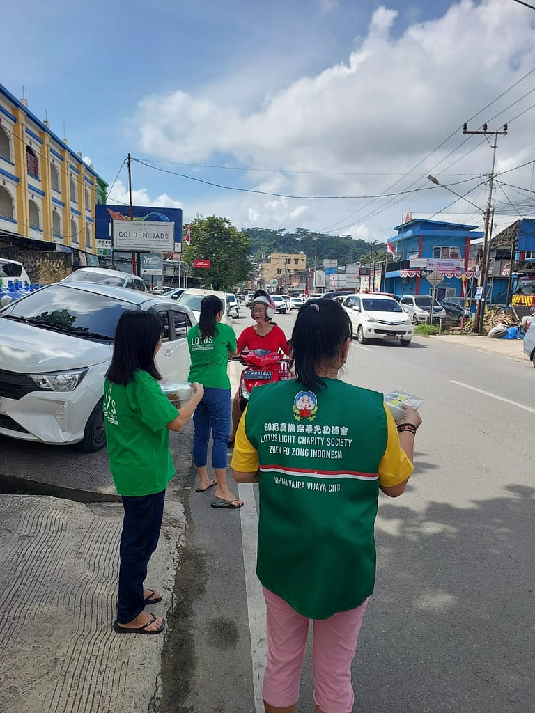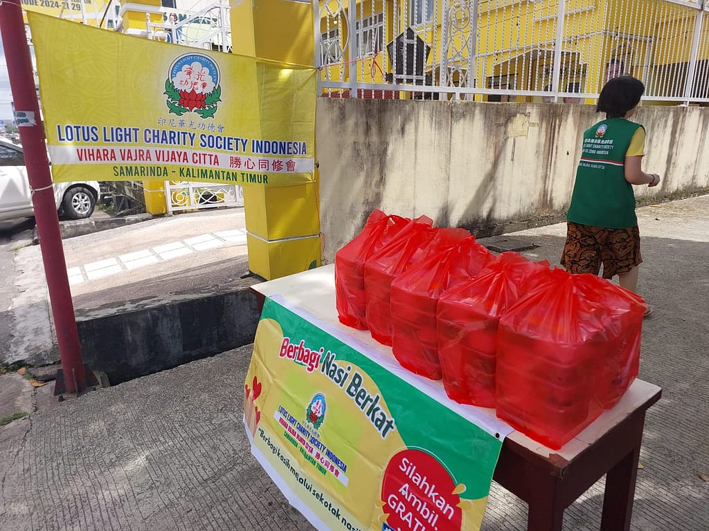 Sekitar pukul 10.00 pagi, sebanyak 250 porsi Nasi Berkat yang dikemas dalam bentuk kotak sudah mulai disiapkan di pinggir jalan di depan Vihara. Beberapa orang pengurus Lotus Light Charity Society Vihara Vajra Vijaya Citta勝心同修會 sudah mulai membagikan Nasi Berkat kepada para pengguna jalan yang terdiri dari pengendara motor, pejalan kaki, ojek online, supir truk dan para pekerja bangunan.
