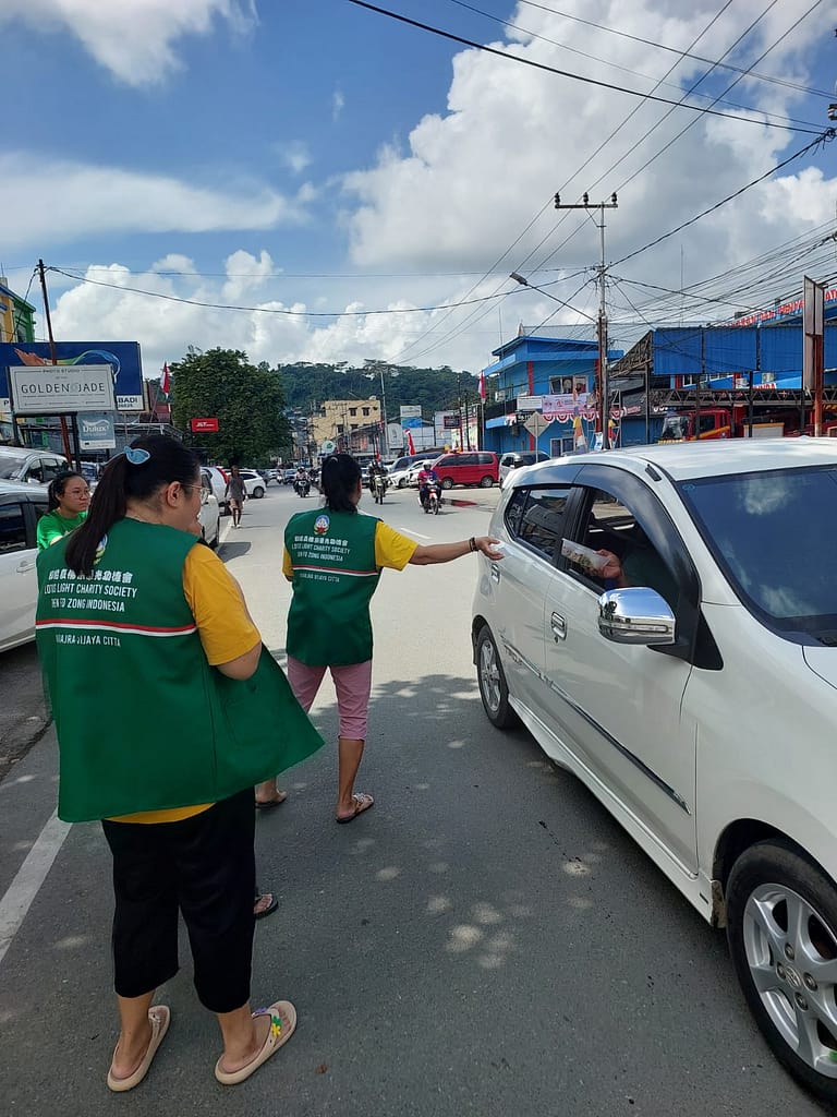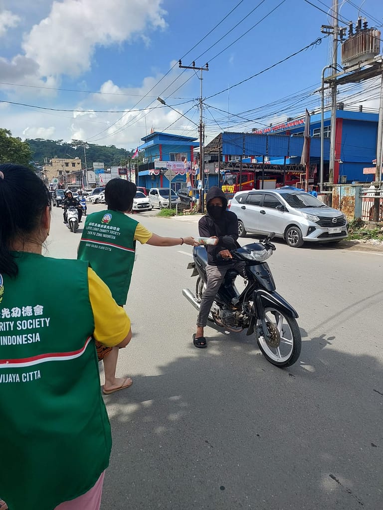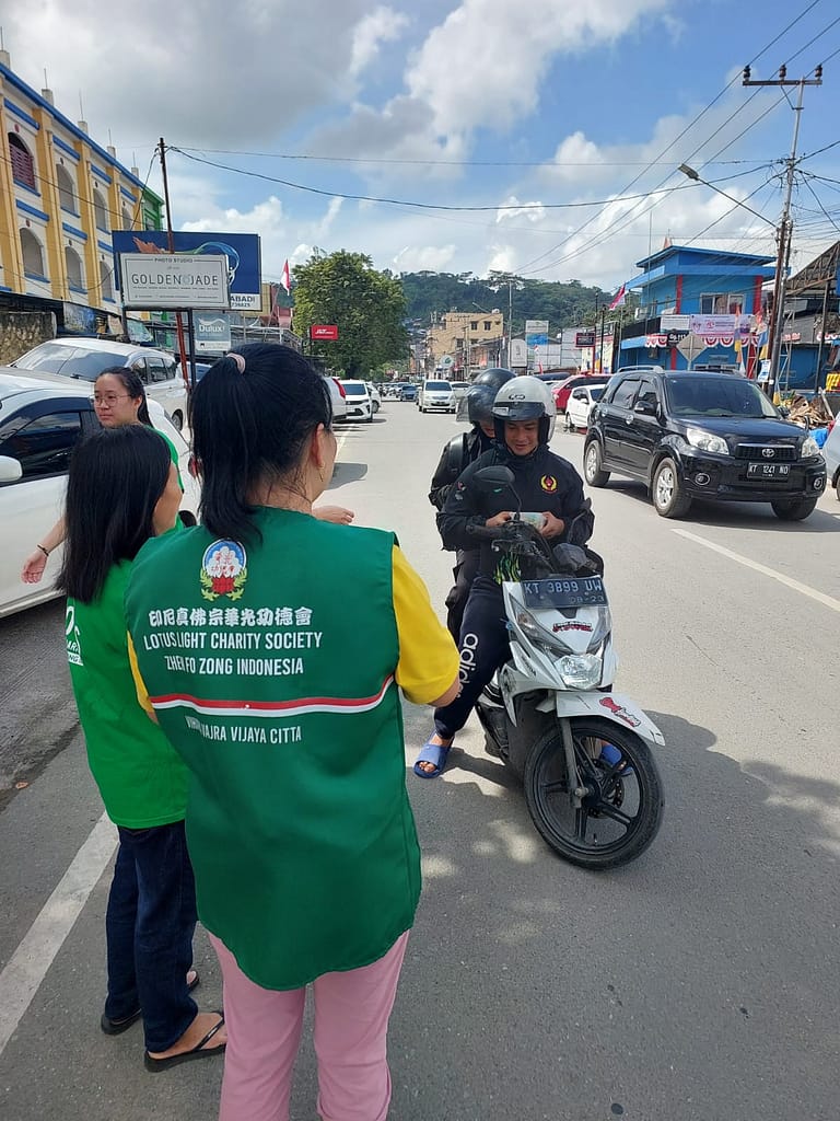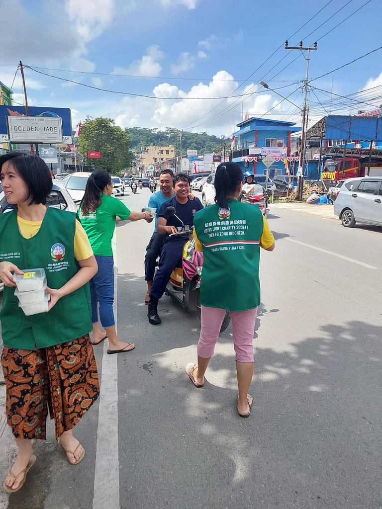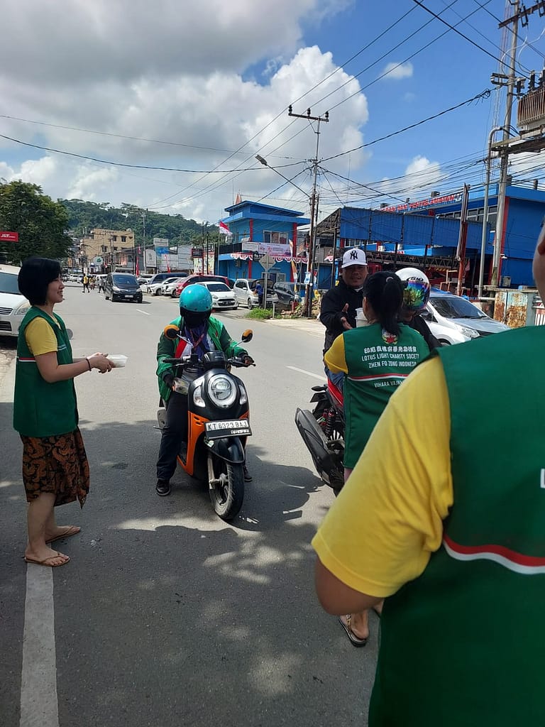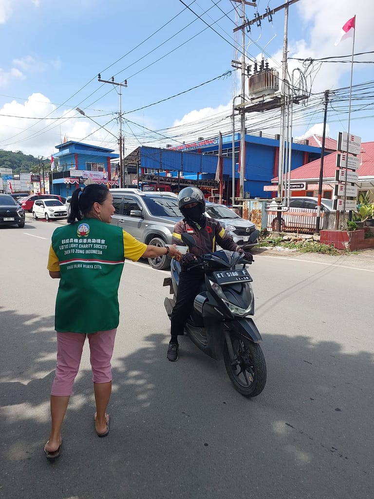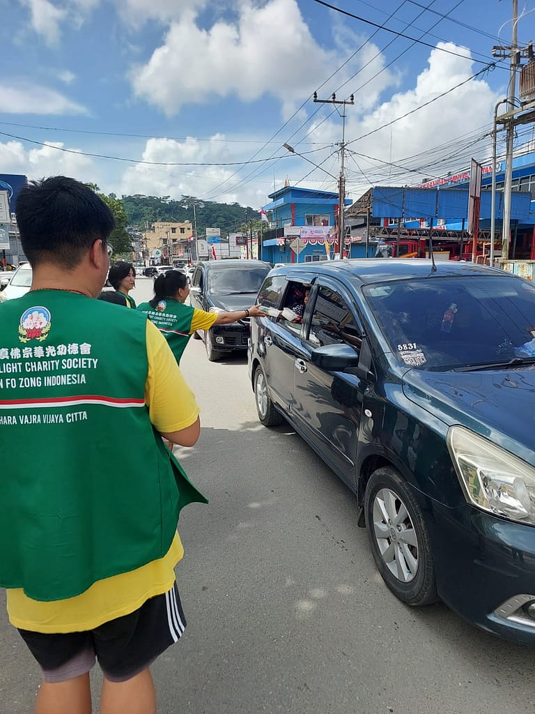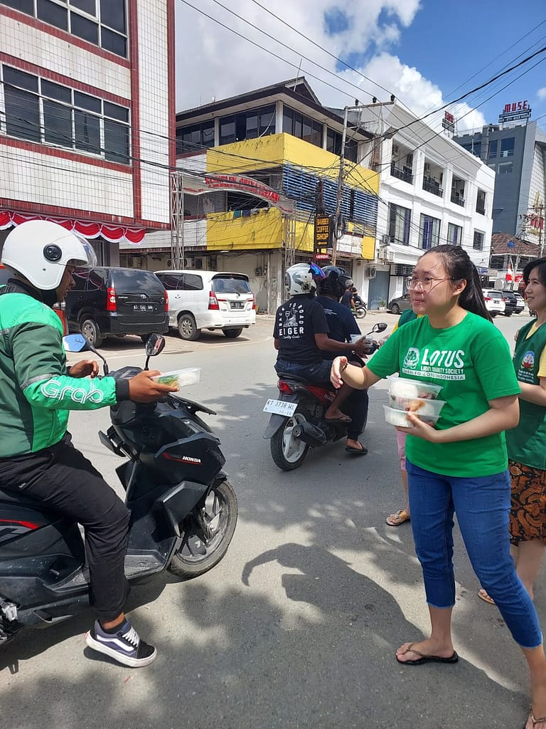 Sekitar pukul 10.00 pagi, sebanyak 250 porsi Nasi Berkat yang dikemas dalam bentuk kotak sudah mulai disiapkan di pinggir jalan di depan Vihara. Beberapa orang pengurus Lotus Light Charity Society Vihara Vajra Vijaya Citta勝心同修會 sudah mulai membagikan Nasi Berkat kepada para pengguna jalan yang terdiri dari pengendara motor, pejalan kaki, ojek online, supir truk dan para pekerja bangunan.