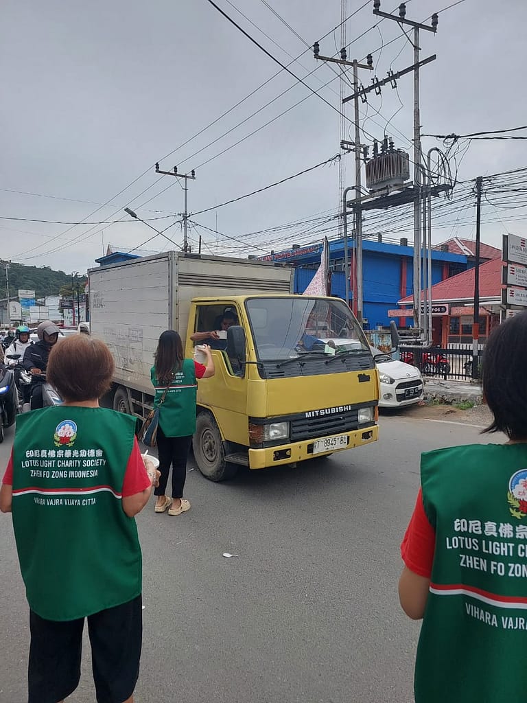 Sekitar pukul 10.00 pagi, sebanyak 230 porsi Nasi Berkat yang dikemas dalam bentuk paper bowl sudah mulai disiapkan di pinggir jalan di depan Vihara. Beberapa orang pengurus Lotus Light Charity Society Vihara Vajra Vijaya Citta sudah mulai membagikan Nasi Berkat kepada para pengguna jalan yang terdiri dari pengendara motor, pejalan kaki, ojek online, supir truk dan para pekerja bangunan.