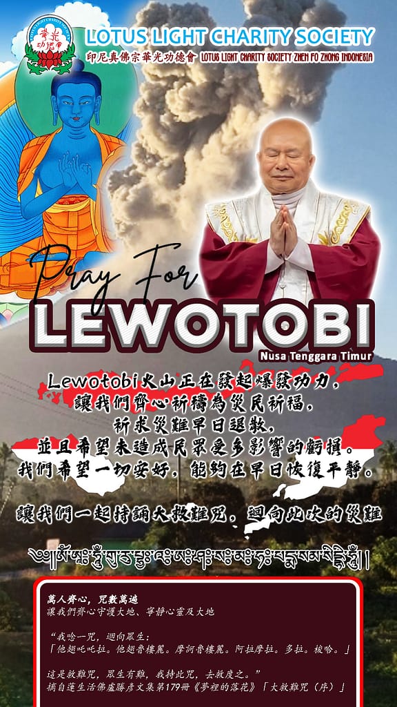 Lotus Light Charity Society Indonesia pada musibah gunung api ini, memberikan bantuan penyaluran dana yang diberikan kepada Perwakilan Gereja Katolik (Keuskupan Agung Pontianak – Kantor Ekonom) setempat sebagai penyalur untuk warga yang tertimpa musibah, dengan ramah Pastor Andreas Kurniawan, OP menyambut kedatangan Biksu Shi Lian Sui (ketua Lotus Light Charity Society Indonesia), setelah menjelaskan maksud kedatangan, Biksu Shi Lian Sui secara simbolis menyerahkan Bantuan dana untuk Bencana Alam Erupsi Gunung Lewotobi – Larantuka Flores Timur.