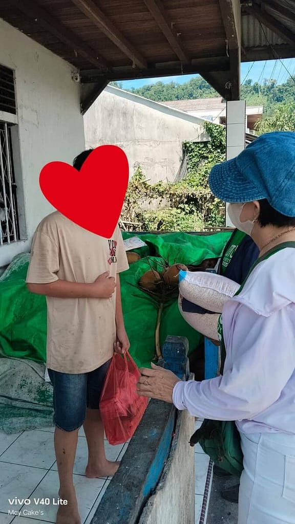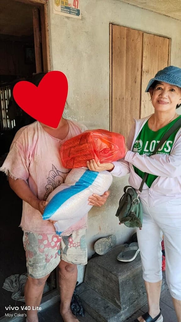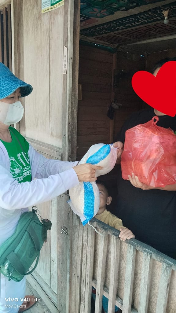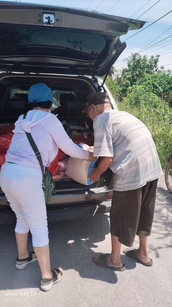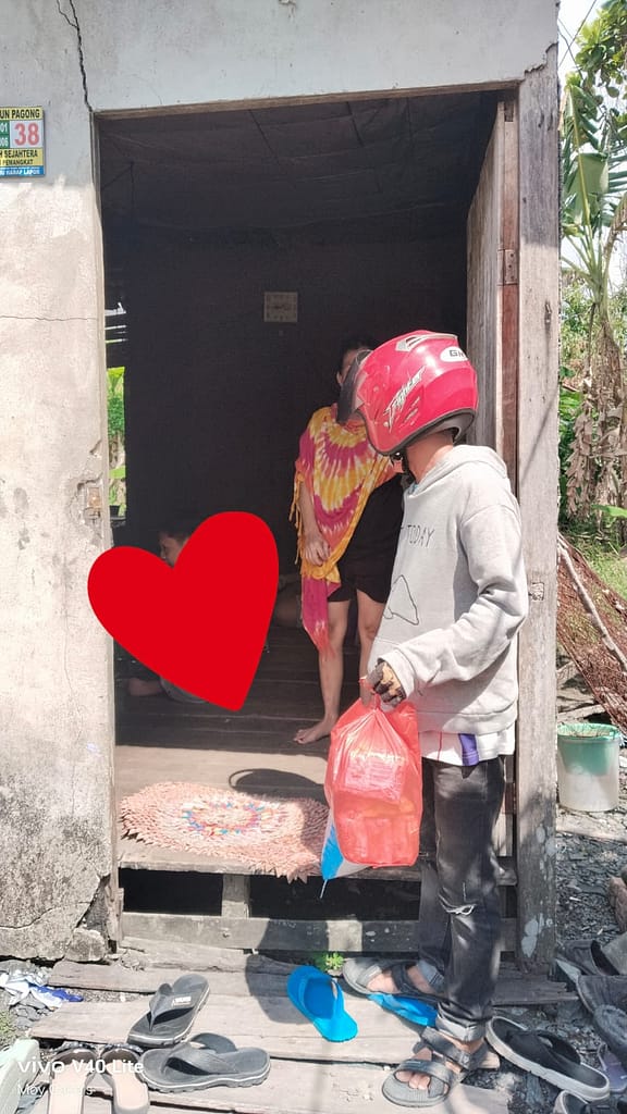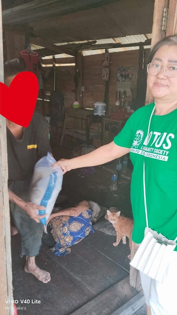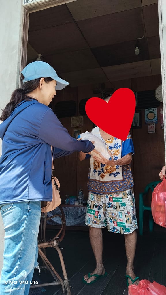 Seorang ibu tua, duduk di lantai kayu, ditemani seekor kucing oranye. Saat menerima beras, tangannya bergetar. Matanya berbinar, seolah menerima kabar gembira yang lama ditunggu.
