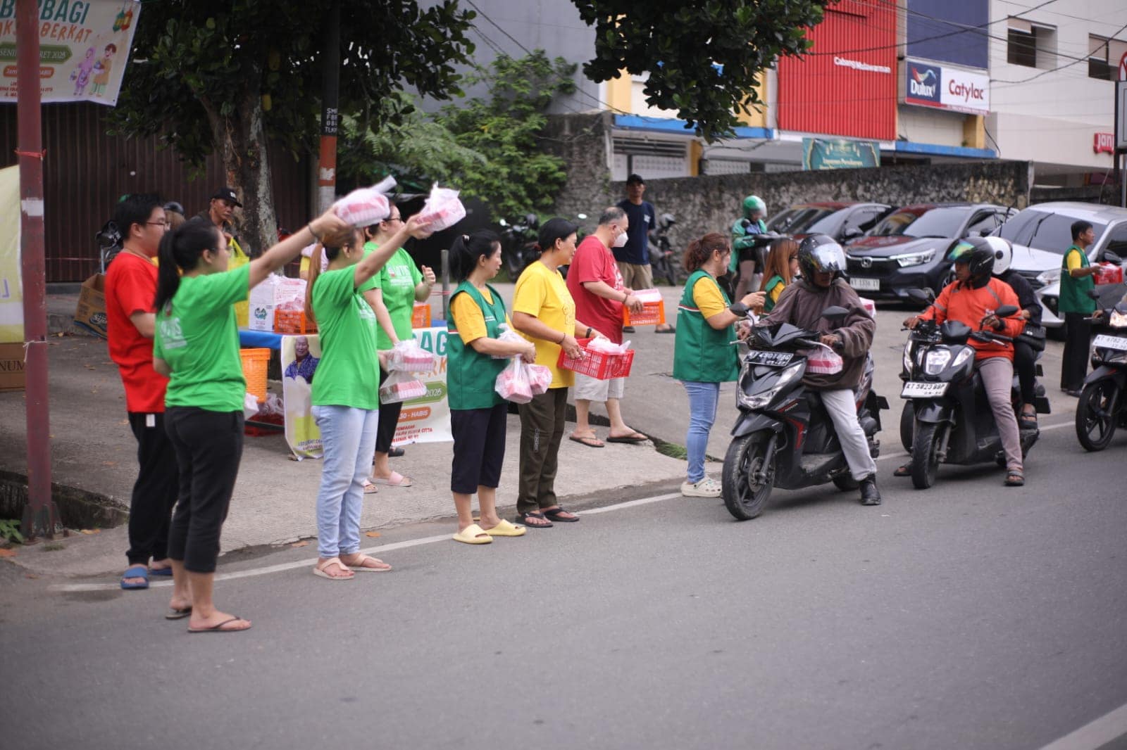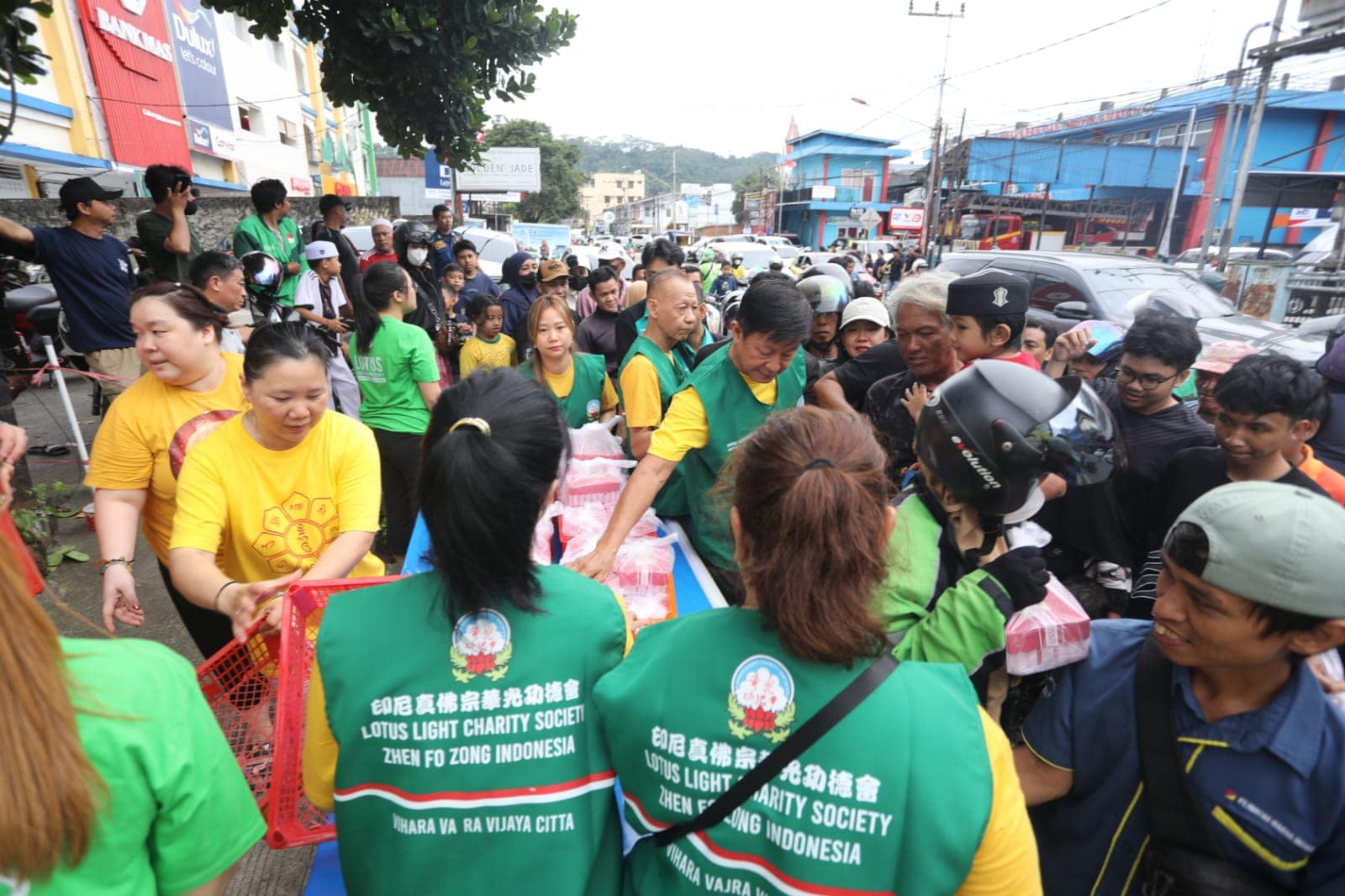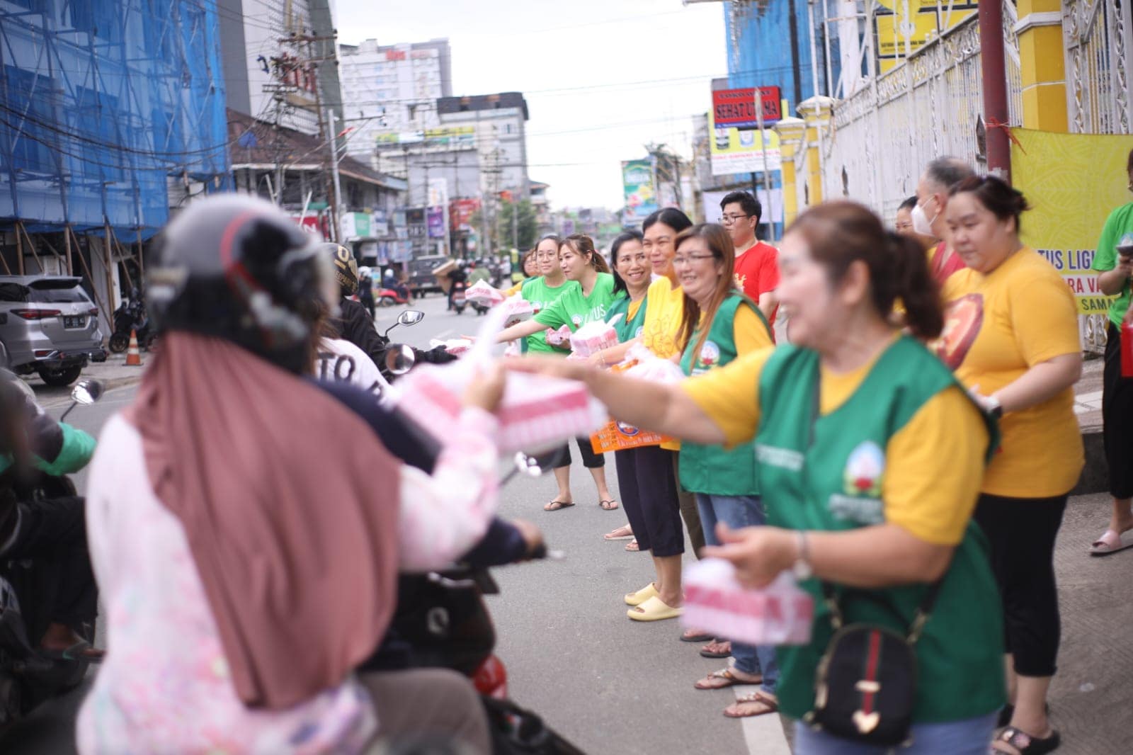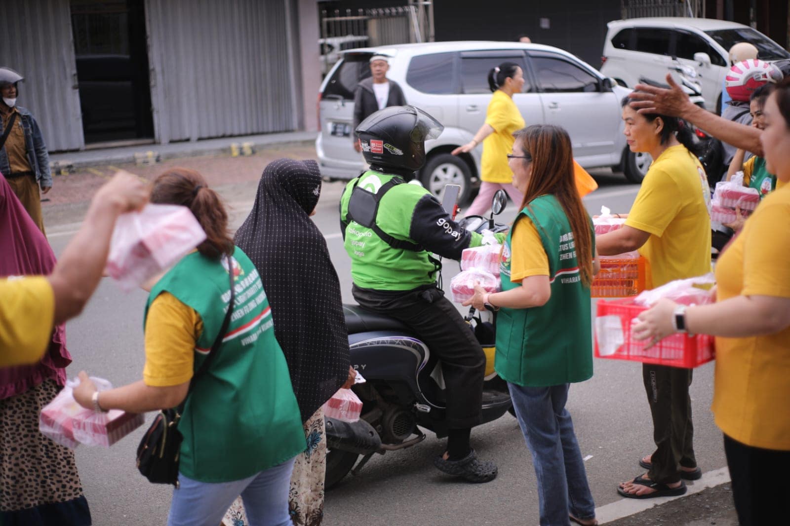 Memasuki pukul 16.00, suasana di depan vihara mulai dipenuhi antusiasme masyarakat. Warga sekitar, petugas pemadam kebakaran, petugas keamanan, para pengemudi ojek online, hingga pengguna jalan yang melintas tampak tertib membentuk antrean untuk menerima takjil. Momen ini menghadirkan suasana hangat yang mempertemukan berbagai lapisan masyarakat dalam satu kebersamaan yang sederhana namun bermakna.